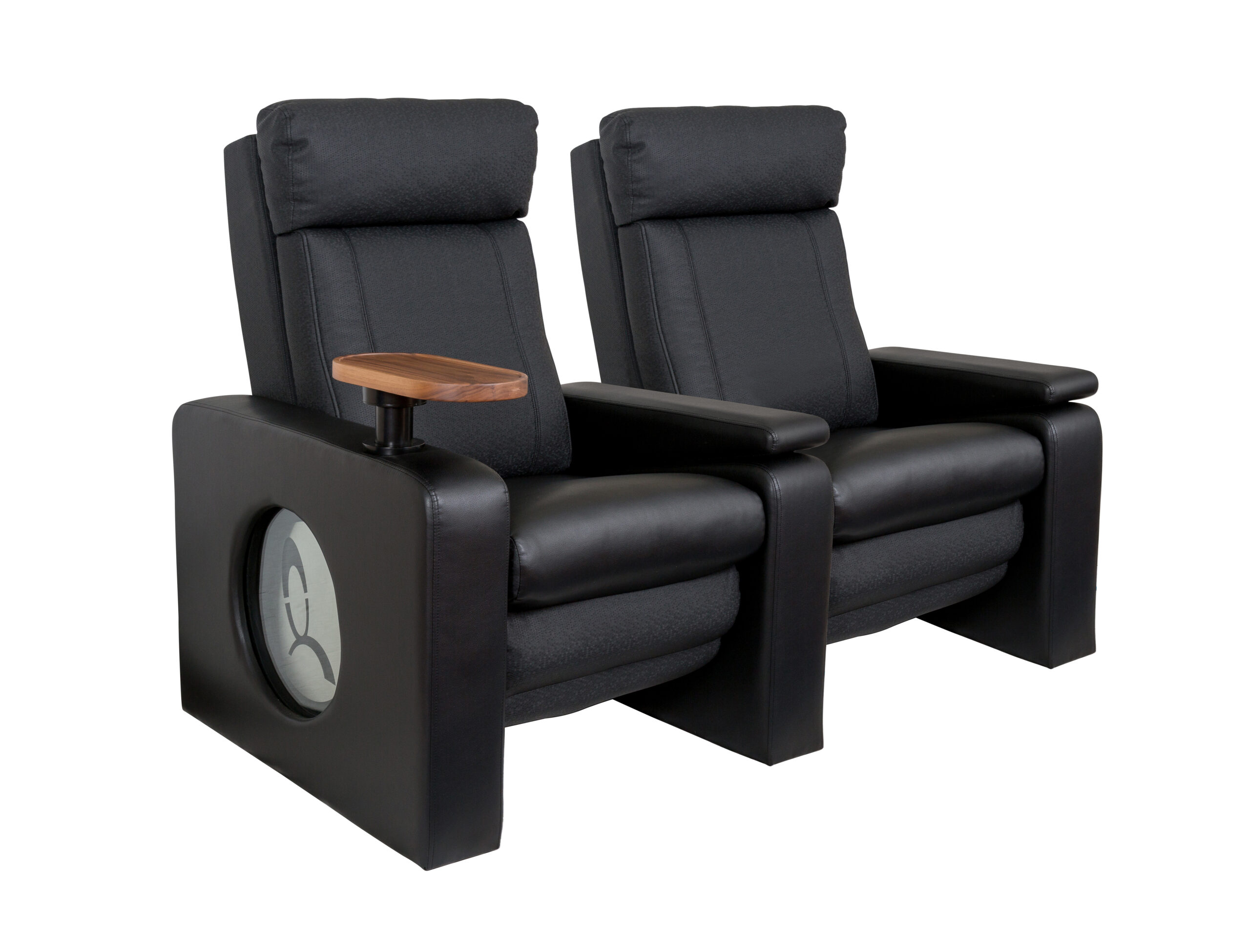 Diablo Micro 2-Seater Cinema Sofa in soft velour fabric with Walnut inset-tables and matching plinth.