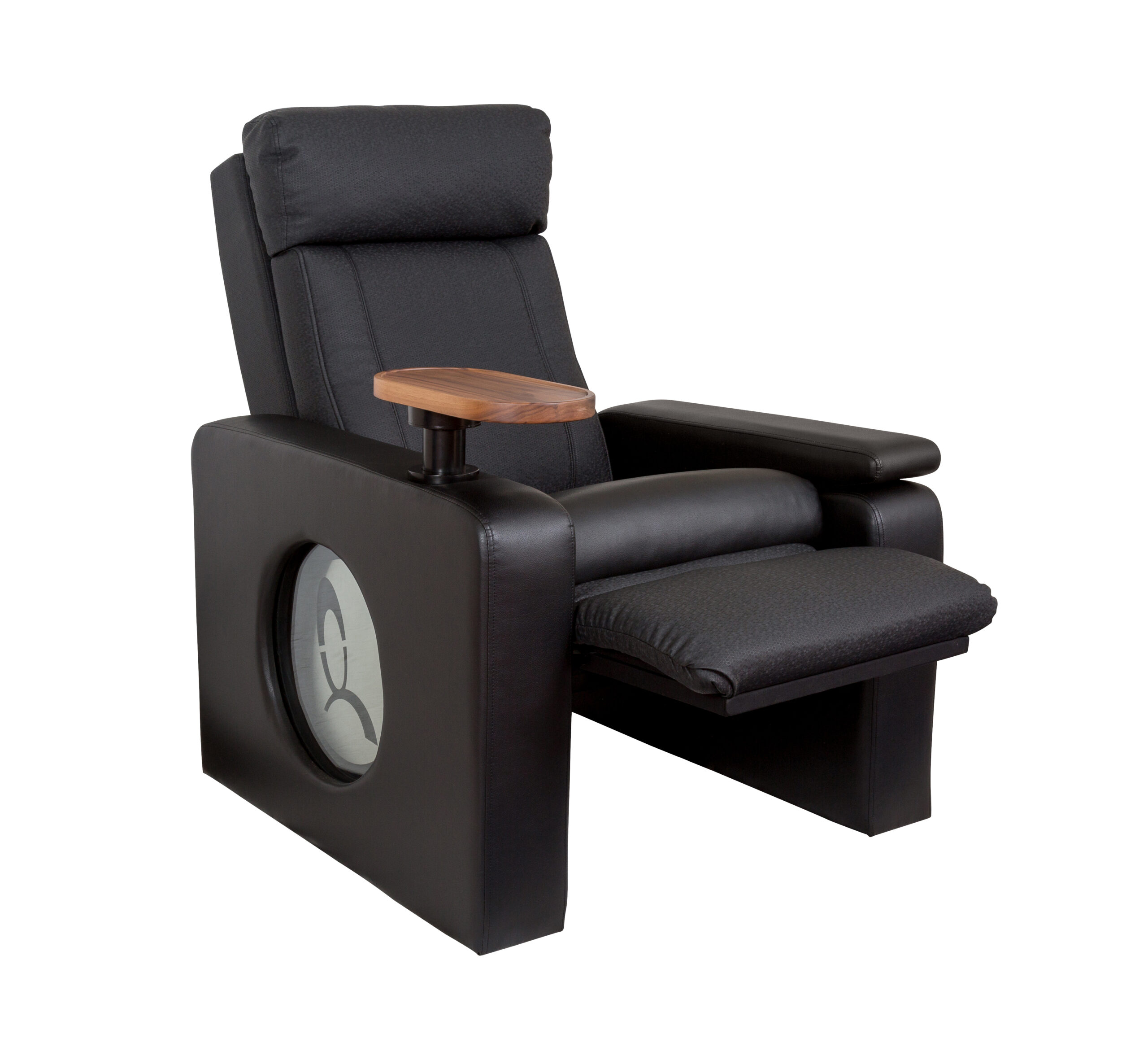 Diablo Single Powerlounger in soft velour fabric with Walnut inset-table and matching plinth.
