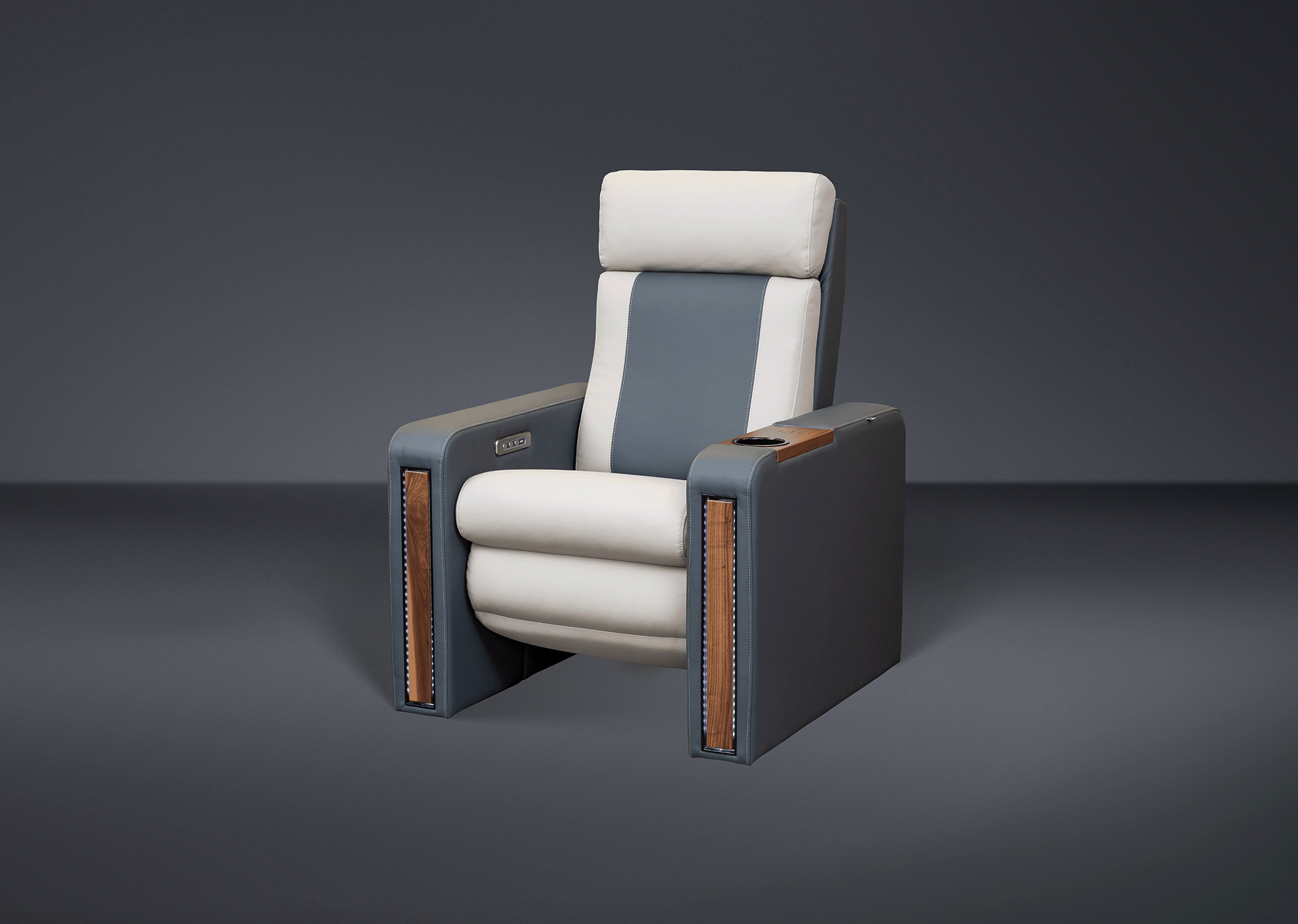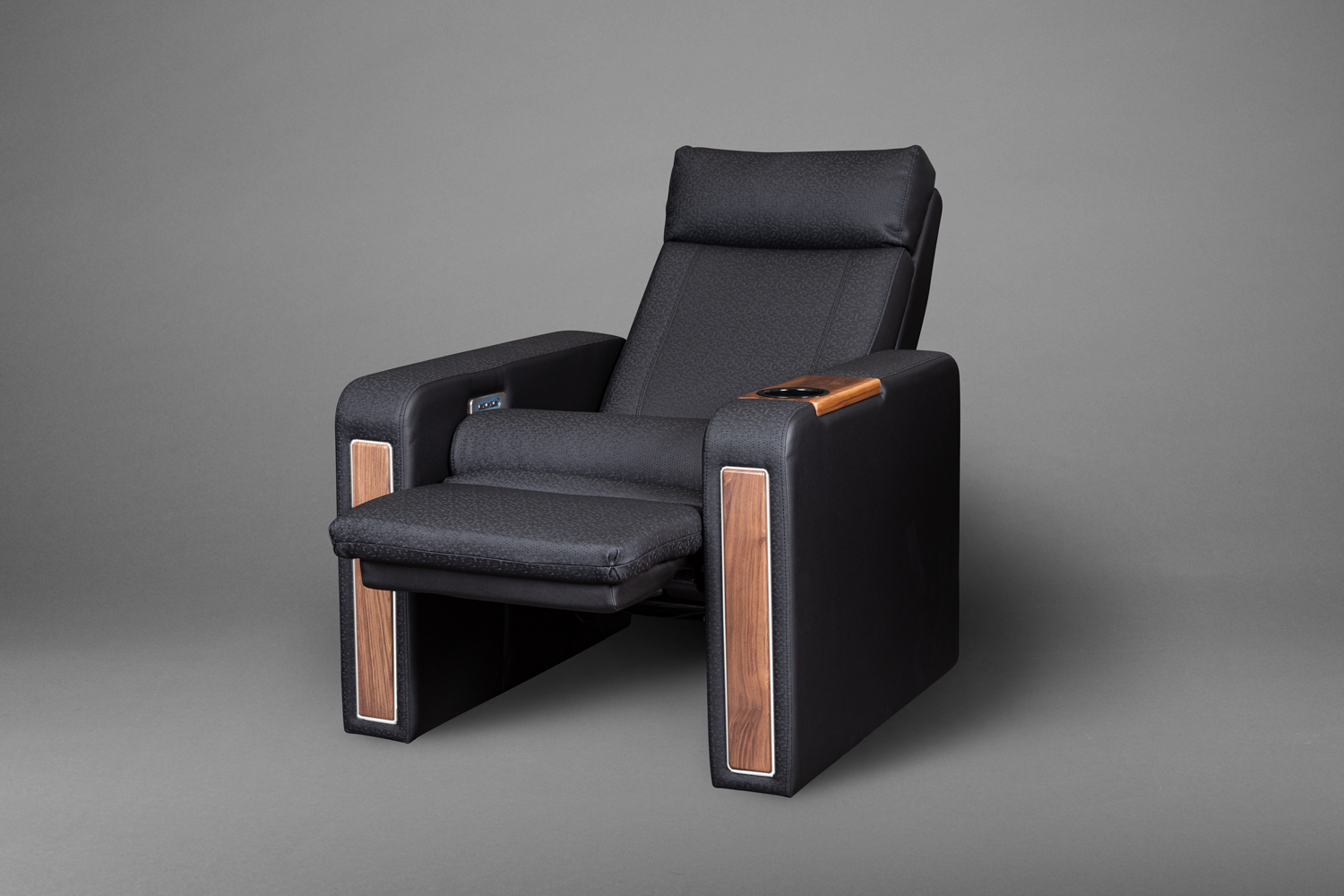 Diablo Platinum Recliner with optional 3rd motor allowing separate Headrest movement, LED illuminated Walnut fascias and Walnut inset-table.